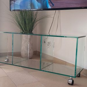 Die TV Glaskonsole Zapping ist in mehreren Abmessungen lieferbar sowohl mit einem Fach oder mit zwei Fächern.